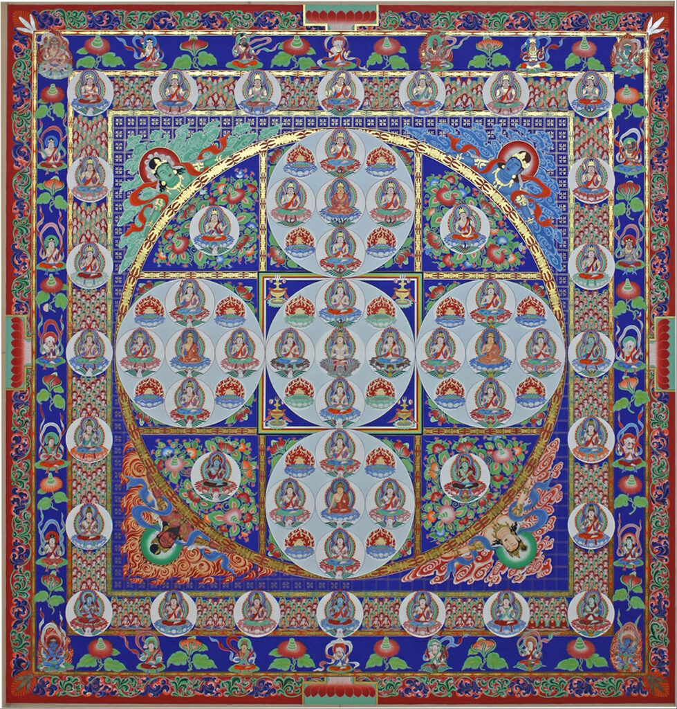 曼荼羅(マンダラ)とは、古代インドの言葉で「聖なる空間」を意味し、わかりやすく言うと「仏さまの集会図(しゅうえず)」である。曼荼羅には様々な種類があるが、その代表的なものとして、胎蔵界・金剛界の両界曼荼羅があり、仏さまの姿を通じて、宇宙の姿と法則をあまねく表現している。